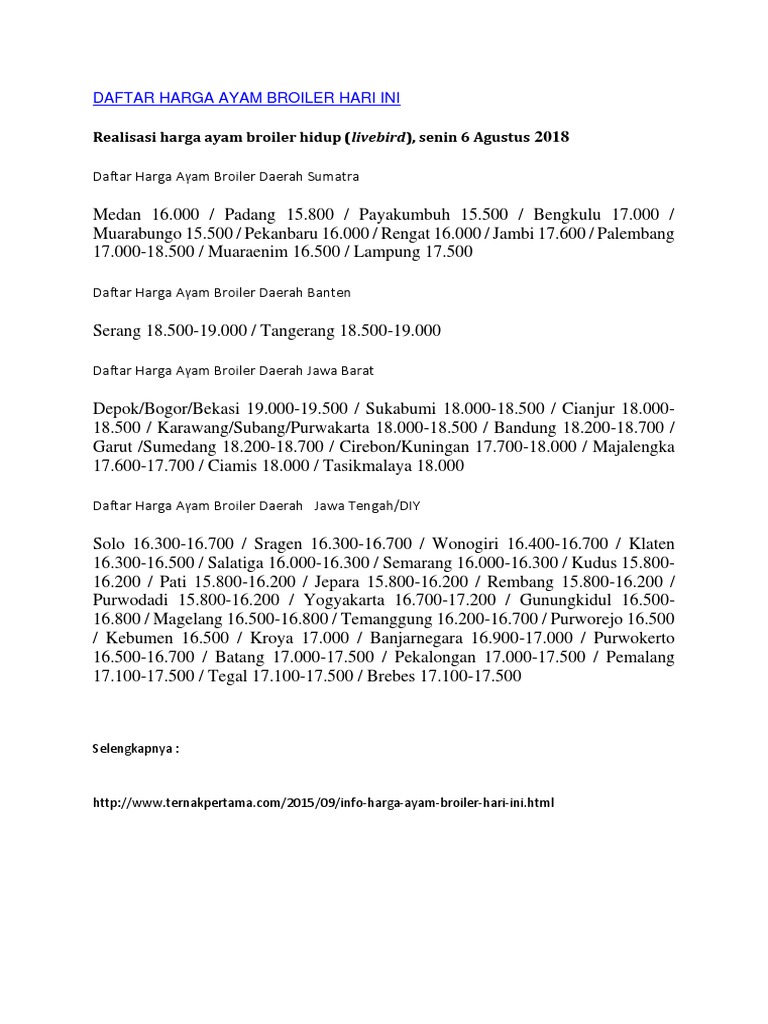 Cek Harga Ayam Broiler Hari Ini Langsung Dari Peternak Aplikasi Pertanian Media Agribisnis Gdm Agri from gdmagri.com Berikut daftar harga ayam broiler terupdate hari ini yang sudah kami rangkum sebagai bahan referensi anda. Harga ayam broiler kalimantan selatan, banjarmasin meski tidak bisa dibilang 100% akurat ini bisa di jadikan referensi untuk panen di tahun berikutnya dengan melihat siklus pengulangan tahunan. Berternak ayam broiler ternyata terbukti menguntungkan. Harga ayam broiler terbaru hari ini (tribunnews.com). ***harga yang tercantum di tabel adalah harga referensi di tingkat produsen. Bagi anda yang setia nangkring dilaman kami tentunya tinggal buka saja dengan mudahnya. Dapat mudah bertambah sehingga ayam ini memiliki hasil produktivitas tinggi dan dagingnya berkualitas bagus. Doc ayam broiler adalah anakan umur 1 hari dari indukan ayam broiler yang ditetaskan oleh perusahaan breeder/ penetasan yang nantinya akan menjadi bibit dari ayam broiler 7.800.
